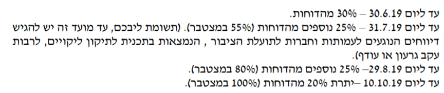 לאחרונה, פנינו והתרענו כי השינויים המפליגים שחלו במתכונת הדיווח והצורך בהיערכות, יוצר קושי בעמידה בזמנים וכי לא תהיה אפשרות לעמוד בהסדר האורכות שנקבע בחודש מרץ 2019, לפיו צריך להגיש עד לסוף חודש זה - 40% מהדו"חות. ביקשנו לאפשר דחיית מועד הגשת הדו"חות בהסטה של חודש ימים, ועד ליום 31.10.2019.
