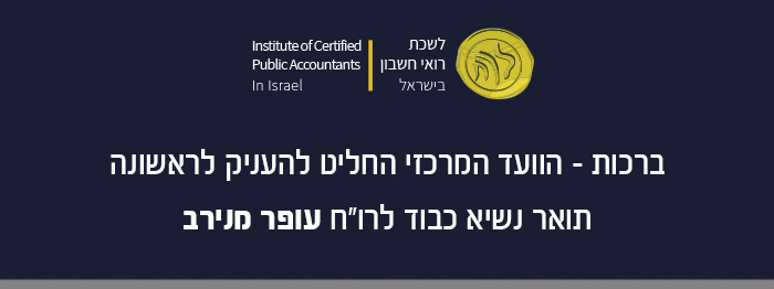 אנו שמחים להודיעכם כי לשכת רואי חשבון בראשות הנשיאה רו"ח איריס שטרק, החליטה להעניק לרו"ח עופר מנירב תואר נשיא כבוד. רו"ח מנירב, המכהן כחבר הוועד המרכזי, כיהן כנשיא הלשכה במהלך שתי קדנציות בין השנים 2000-2006.